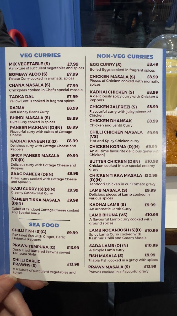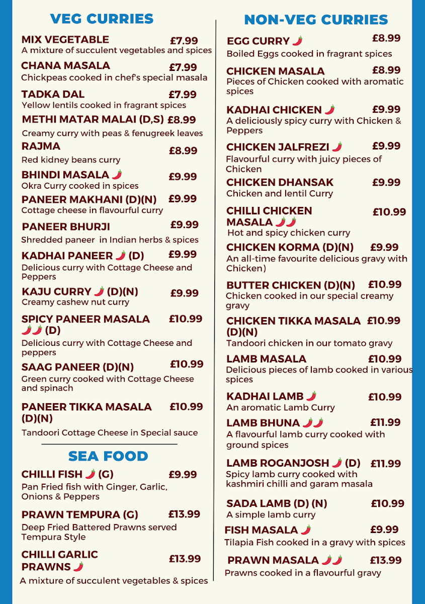 Comes with a choice of Curry, Plain Rice, Naan or Roti, Poppadum & Salad. Mix Veg, Channa Masala, Kadhai Paneer or Tarka Dal